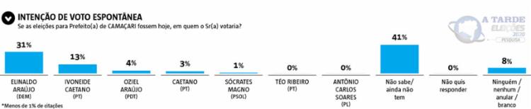 Ex-prefeito do município e marido de Ivoneide, Luiz Caetano foi citado por 3% dos entrevistados como opção de voto, enquanto Sócrates foi mencionado por 1% do eleitorado ouvido. Na pesquisa espontânea, 41% disseram ainda não ter decidido o voto.