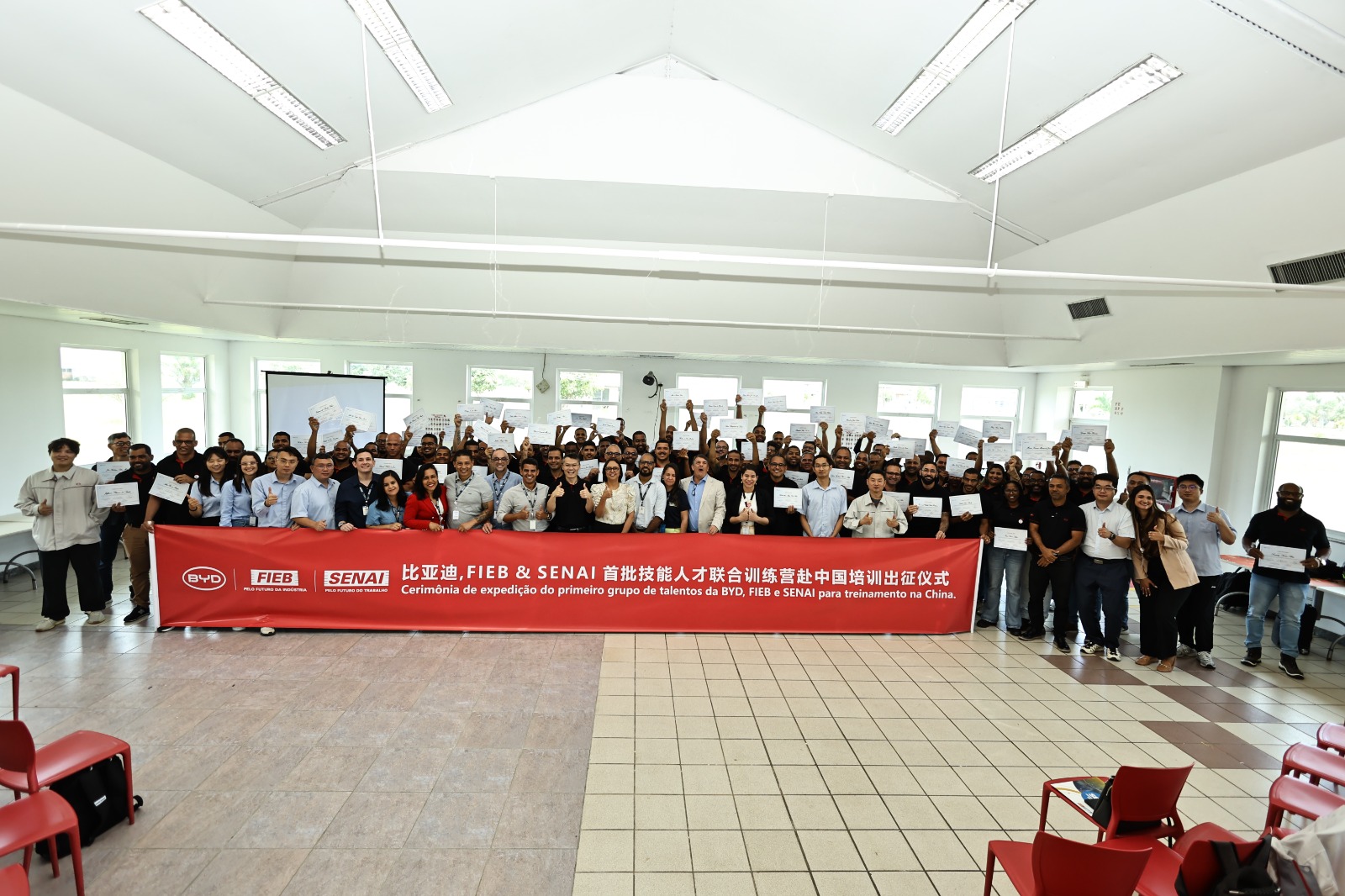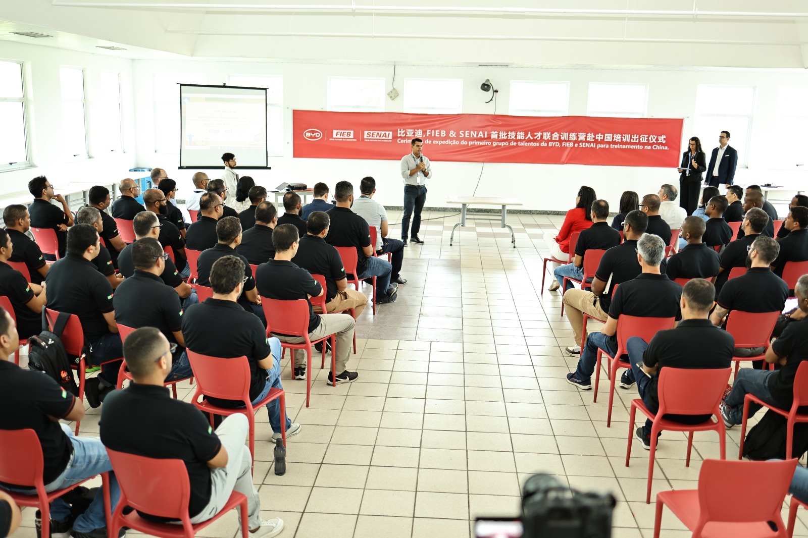 Desta vez, a turma é composta por mais de 70 profissionais, sendo 35 colaboradores aprovados no curso de aperfeiçoamento profissional em operação automotiva oferecido pelo Senai, em parceria com a BYD. Também irão líderes de produção recém-contratados, professores do Senai e tradutores. Quase todos os contratados do grupo são baianos, sendo a maioria de Camaçari, onde está sendo construída a maior fábrica da companhia fora da Ásia.